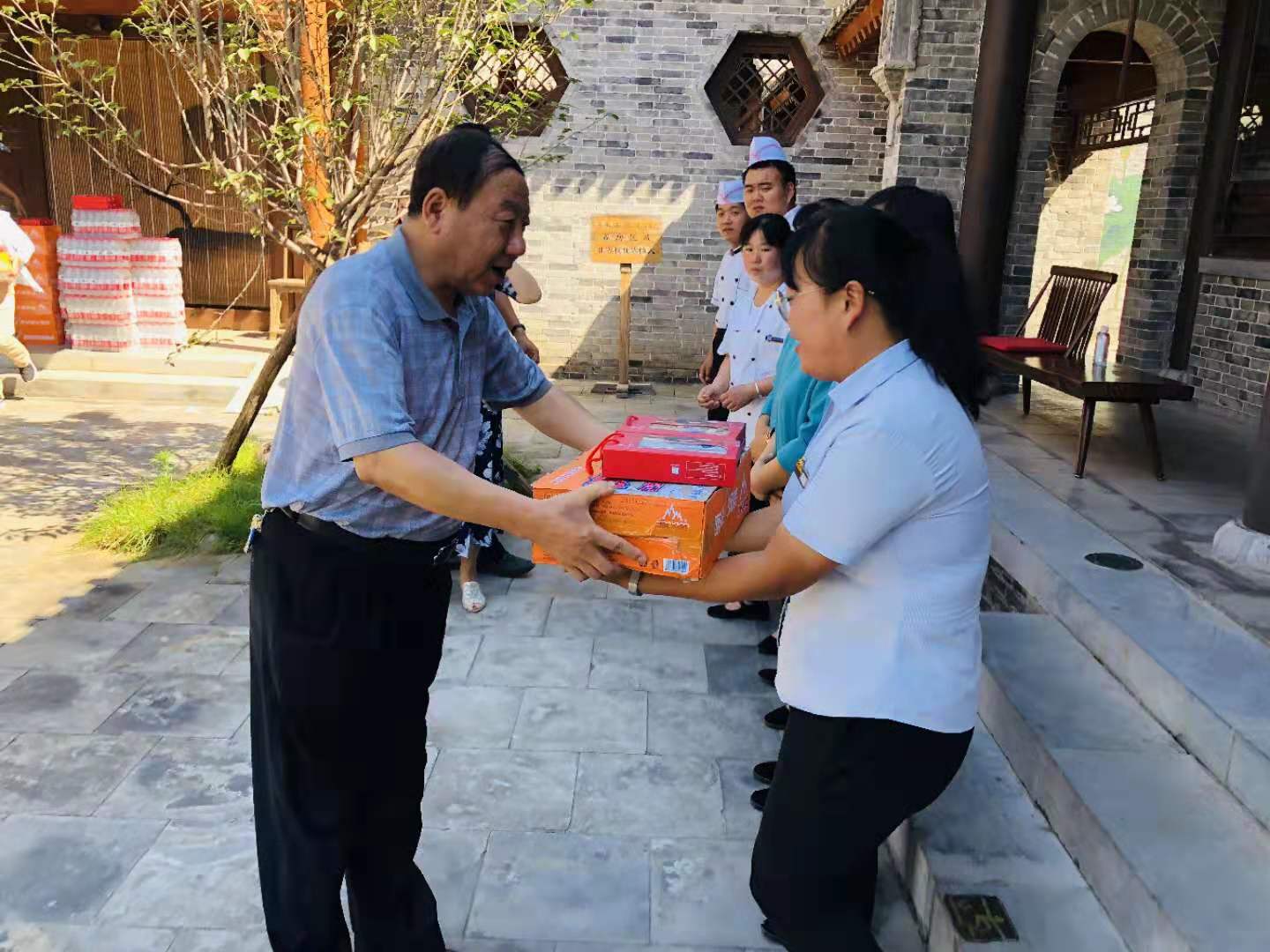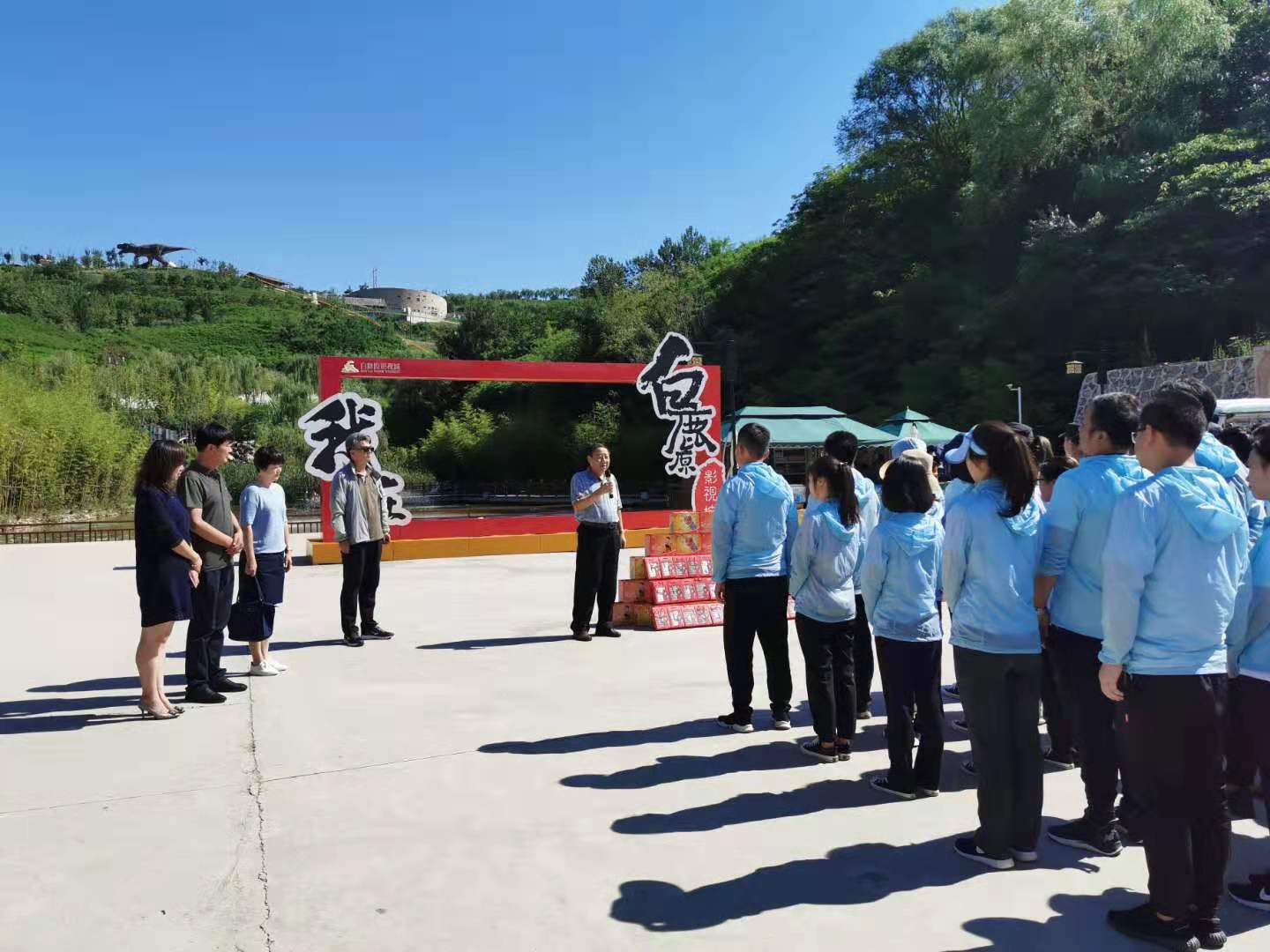 8月13日上午,陕旅集团公司工会主席李小元、群团部部长、机关工会主席柴晓梅、党群工作部张蕾一行在白鹿原公司总经理聂文海、运营总经理江涛、工会主席唐敏的陪同下,顶着炎炎烈日,深入景区一线,给在高温酷暑中坚守岗位的一线员工发放了防暑降温用品,给大家送来了清凉和关怀。