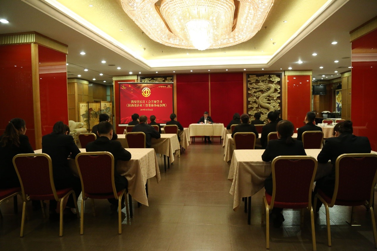 《陕西省企业工资集体协商条例》(以下简称《条例》)宣传活动月已经正式拉开了序幕,为提高广大职工对《条例》的知晓率,营造良好的社会氛围,11月14日下午,西安唐乐宫有限公司工会第一时间上传下达,认真部署,组织工会各组长及部分职工代表认真学习《条例》。学习活动由西安唐乐宫有限公司工会副主席李程主持。