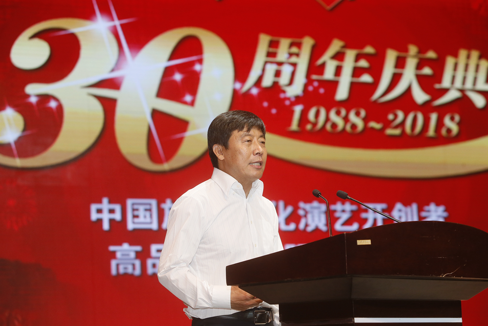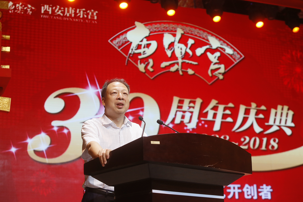 陕旅集团董事长周冰在致辞中表示,30年前的今天,唐乐宫正式成立,唐乐宫和中国改革开放的里程合拍、合乐,高举中国旅游文化旗帜,开创了中国旅游文化的先河。三十年来,唐乐宫为中国旅游接待、中国的外交事业做出了突出贡献,在旅游界后来出现的所有旅游演出如京剧乃至实景演出都是脱胎、参照于唐乐宫。