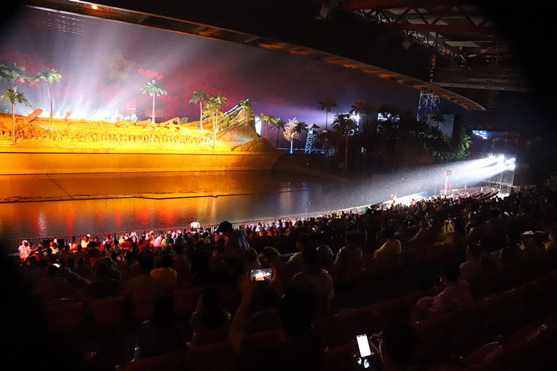 海南省委常委、省委宣传部肖莺子部长率全省文明城市创建工作经验交流会嘉宾一行首先观演了大型椰海青春实景影画•红色娘子军,尽管当晚下着雨,红色娘子军的演出依旧按时与观众见面,风雨并没有阻挡演员们饱满的热情,精彩纷呈、感人震憾的演出,让观众和嘉宾热情高涨,掌声经久不绝。