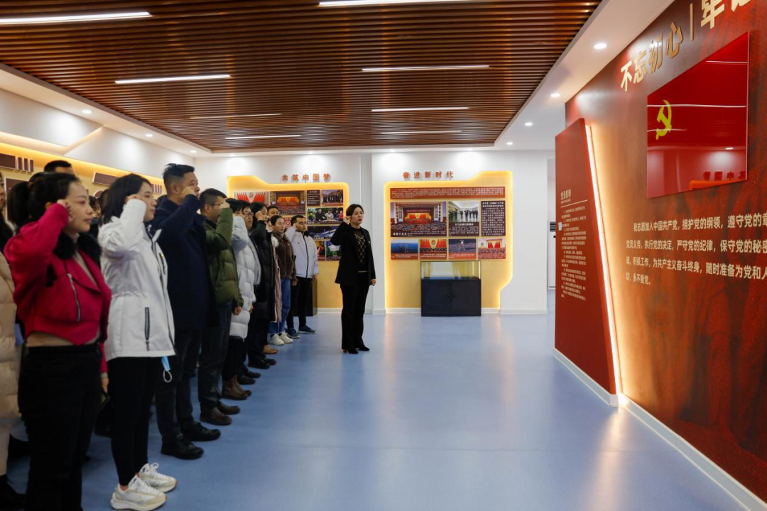 在党员政治生活馆内,跟随着讲解员的步伐,党员干部先后参观了“一镜一廊三室”五大功能区,依次为正容镜、党史学习教育长廊、警示警醒室、党性体检室、“三会一课”室。通过场景、实物、影音等形式系统直观地向党员干部展示了学什么、怎么学、怎么做,回顾了我党发展进程中的重大历史节点,领略了革命先辈关于共产党人的初心使命。在党旗前,全体党员干部紧握右拳,重温入党誓词。