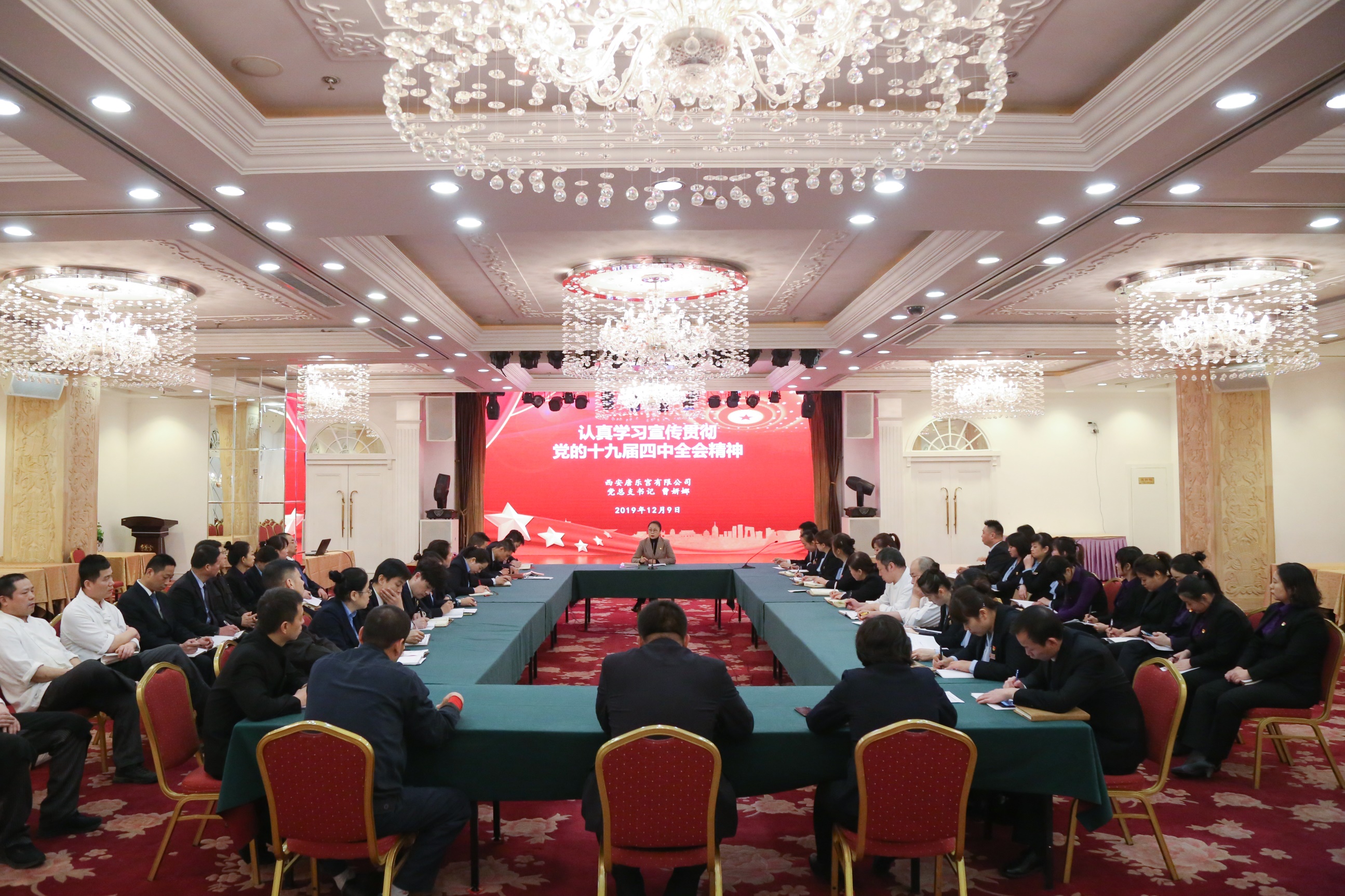 12月9日下午,西安唐乐宫有限公司党总支开展党的十九届四中全会精神宣讲报告会。此次宣讲会是面向企业全体党员干部、中层管理的一次学习宣传贯彻动员会,旨在进一步深化全员对全会精神理解,提高公司改革发展的能力和水平。学习宣讲由西安唐乐宫有限公司党总支书记曹妍娜主持,全体党员干部、中层管理及入党积极分子参加。