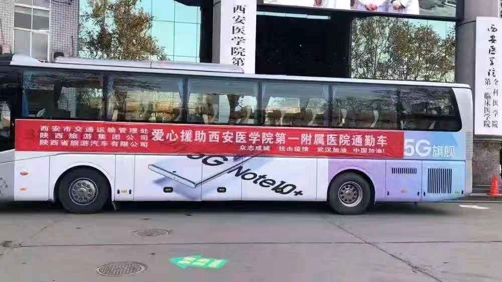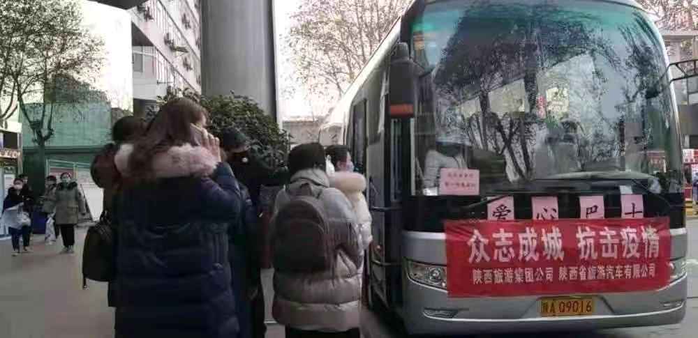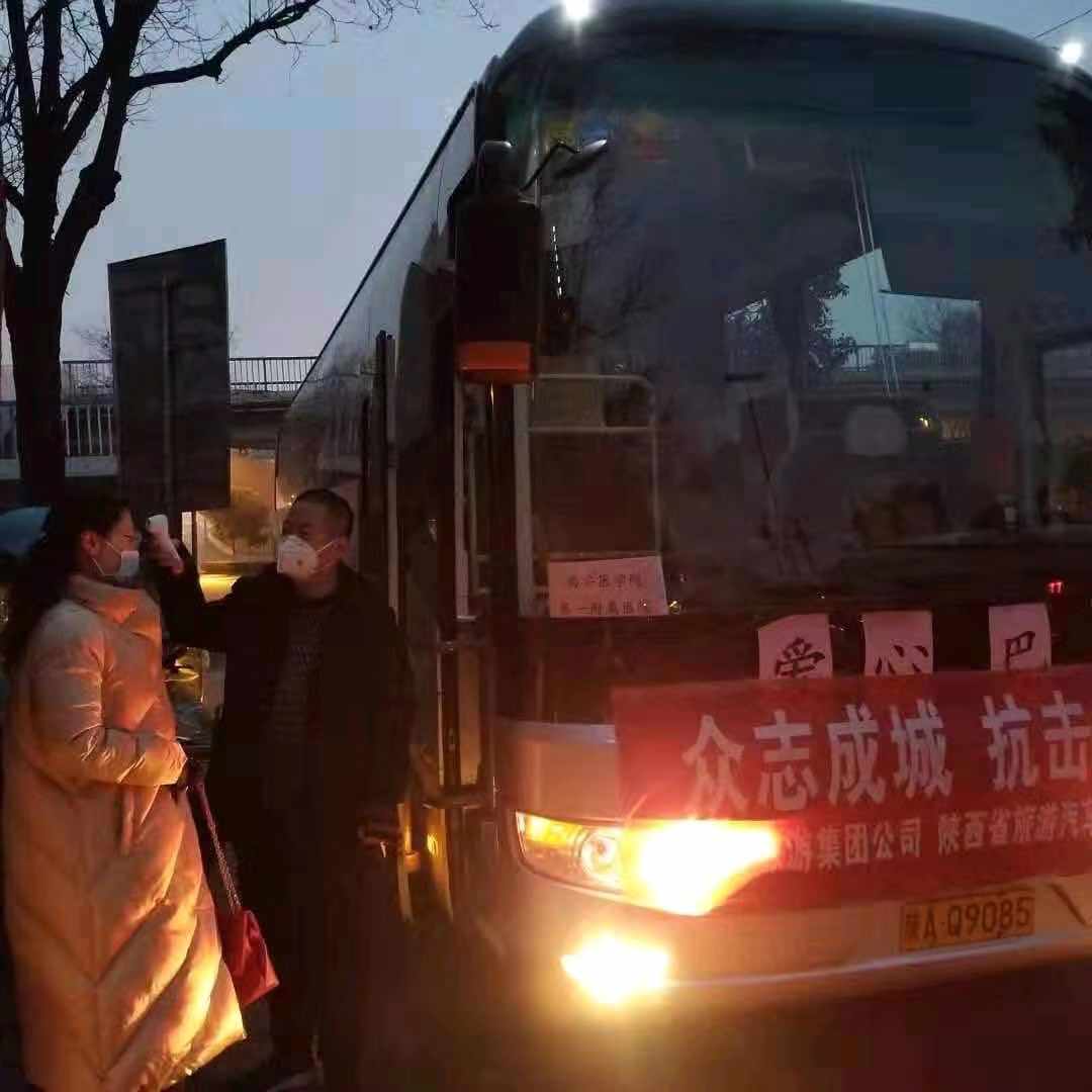 2月4日,一切工作准备就绪,4台50座客车开通运行,按照医院需求线路,每天将医护人员送达指定地点。医院和医护人员对陕旅及时有力的援助给予了高度评价,他们表示:感谢你们在非常时期的大爱义举,义务接送我们上下班,向你们表示崇高的敬意!爱心车队的一名驾驶员在报名时说,“现在全国医护人员逆行出征,我是老党员当然要上,能做这一点小事很高兴”。