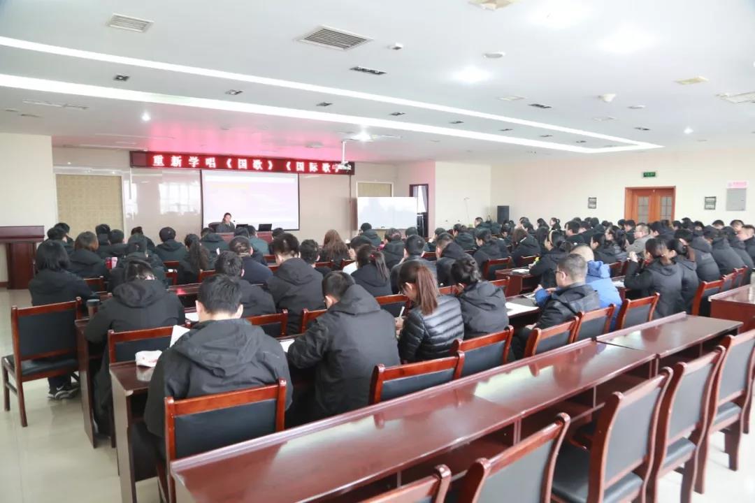 公司特邀请中国声乐协会会员、陕西省音乐家协会会员、华阴市音乐家协会副主席王红娟为全体员工授课。王老师生动形象的为大家讲授发音技巧,深刻解读了国徽、国旗的含义,《国歌》及《国际歌》的创作背景与社会影响。当雄壮有力的《国歌》、《国际歌》响起时,全体参训人员庄重严肃,在激昂的歌声中重温当年浴血奋战的日子。通过王老师的详细讲授,使全员从思想上更加深刻地了解了《国歌》、《国际歌》的内在与演唱技巧,最终圆满完成合唱。
