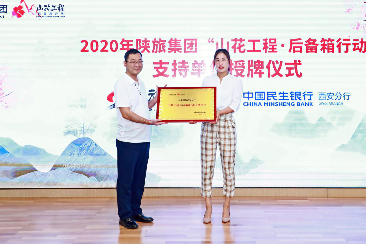 陕旅集团授予民生银行西安分行2020山花工程·后备箱行动支持单位牌匾。