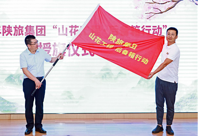 陕旅集团党委委员、纪委书记、监察专员王晓亮将2020山花工程·后备箱行动活动旗帜授予活动执行总领队董长江手中。