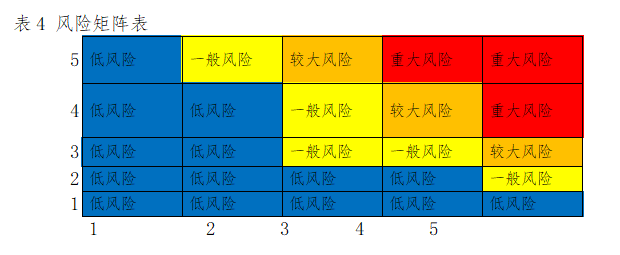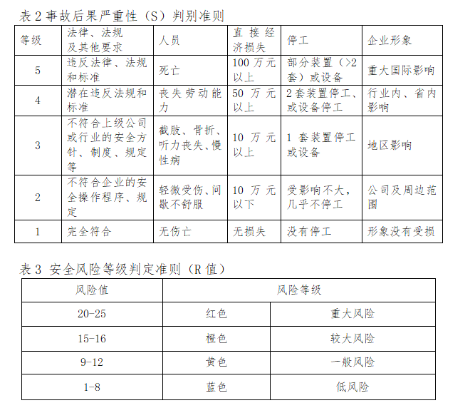 三级公司安全管理部门负责组织本公司相关部门对识别出来的危险源采用风险矩阵法(LS)进行风险评价。风险矩阵法(简称LS),R=L×S ,其中R是危险性,事故发生的可能性与事件后果的结合, L是事故发生的可能性;S是事故后果严重性;R值越大,说明该系统危险性大、风险大。