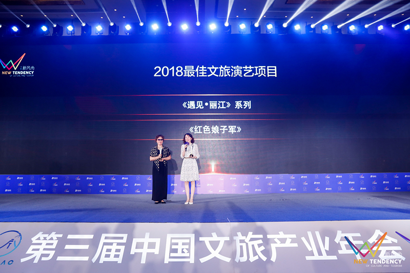 陕旅(三亚)旅游投资有限公司总经理助理王英英代表公司上台领奖并发表了获奖感言,红色娘子军实景演艺以今天为起点,真诚地感谢社会各界对红色娘子军演出的喜爱和支持,本着“陕旅出品,必是精品”的宗旨,盛情邀约与会代表6月10日莅临剧场,共同见证演出震撼归来。我们将一如既往地以优质的服务和精湛的演出回报观众。