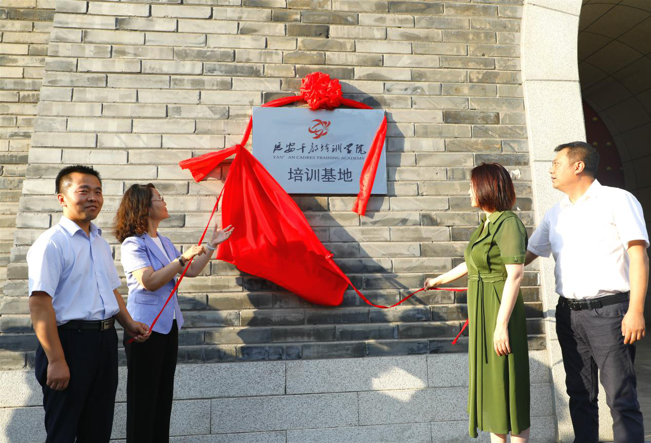 延安干部培训学院庄庆萍、刘宁,陕旅集团延安公司副总经理吴亚光、胡江共同为 “延安干部培训学院金延安培训基地”揭牌。