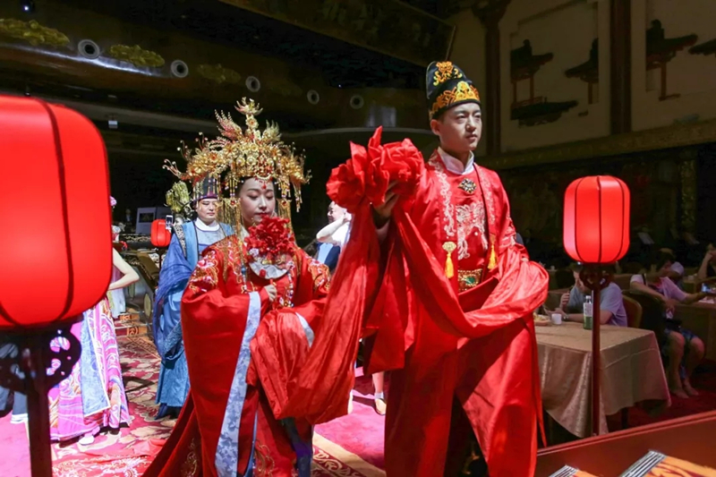 近年来,中国大陆婚礼掀起一股回归传统的热潮,不管是学生们身着汉服参加18岁成人礼,还是七夕节举行乞巧、祭月等活动,都充分体现了人们对国学和传统民俗的认同。西安是我国文化最鼎盛的时代之一,在这片历史古都,无时无刻都彰显着汉唐韵味,无穷无尽。从1988年落建的首座仿唐歌舞剧院——西安唐乐宫,极具代表性的餐厅把这座城市的文化特色、美食元素融入当中,形成独有的、地标性的文化魅力。