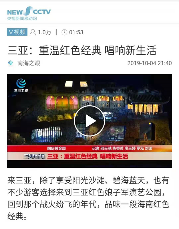 金秋十月,为庆祝新中国成立70周年,红色娘子军演艺公园策划开展了"壮丽七十年 青春正当红"系列主题活动。红色娘子军实景演出已成为海南文化旅游的新亮点并得到了中央电视台、海南卫视、人民网、凤凰网等20余家主流媒体的大力宣传。