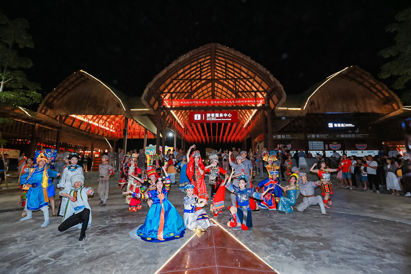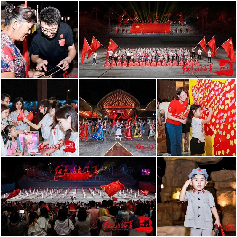 大刀舞、民族舞《母亲是中华》、竹竿舞、扇子武术、红旗颂等精彩绝伦的红色歌舞汇演,吸引了众多游客驻足观看,并争相与演员们一同起舞,合影留念。
