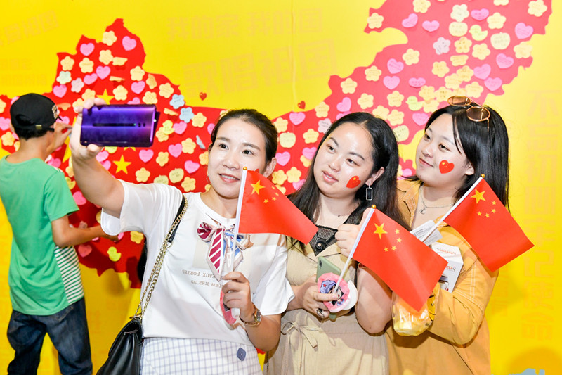 来自全国各地的游客前来观看精彩文化演出、同唱红歌、体验特色活动,用别具新意的方式祝福祖国。