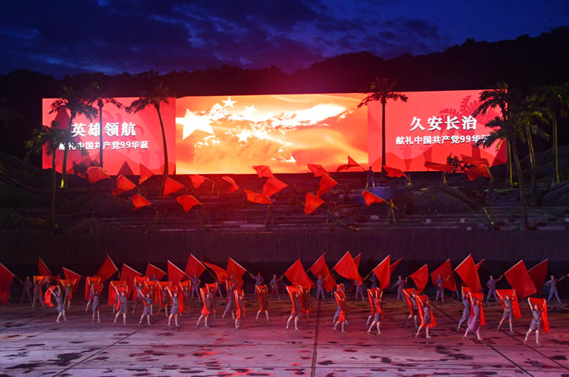 在美丽的夜色中,三亚红色娘子军演艺公园被璀璨点亮,焕发出“鹿城”三亚的夜间魅力。启动仪式通过《英雄领航·久安长治》《英雄伟业·久立琼崖》《英雄归来·久别重逢》三大篇章,庆祝建党99周年,致敬时代英雄。