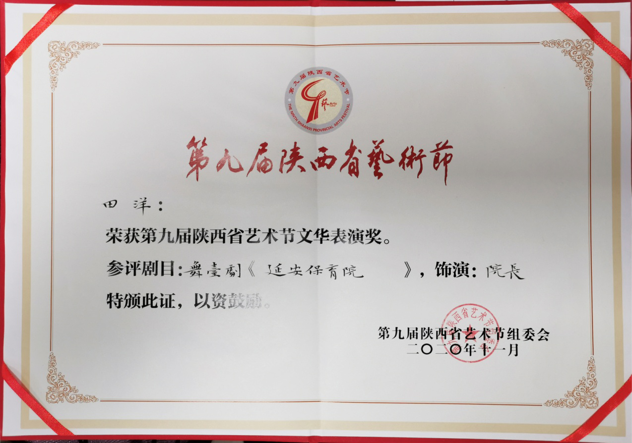 近日,第九届陕西省艺术节组委会下发《关于公布第九届陕西省艺术节获奖名单的通知》。大型红色历史舞台剧《延安保育院》荣获“文华剧目奖”,《延安保育院》艺术团副团长、院长饰演者田洋荣获“文华表演奖”。