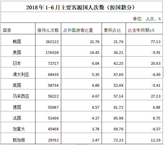 2018年1-6月累计接待入境游客166.63万人次,比去年同期提高14.41%。其中:全省接待外国人120.44万人次,比去年同期提高15.98%;香港同胞17.07万人次,比去年同期提高13.01%;澳门同胞8.32万人次,比去年同期提高9.82%;台湾同胞20.8万人次,比去年同期提高8.79%。1-6月实现国际旅游收入11.8亿美元,同比增长16.37,其中人均花费比上年同期增加11.91美元,提高了1.71%;人均天花费达到284.73美元,比上年同期提高0.66美元。