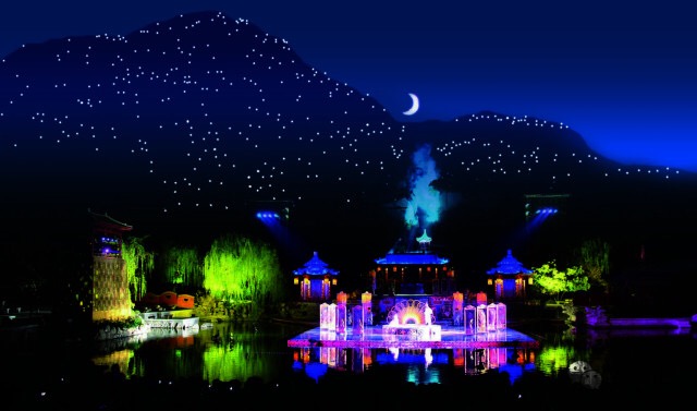 骊山脚下华清宫,沉沉夜色之中,九龙湖为舞台,骊山为背景,楼、台、殿、榭等美景皆入剧中,在唐明皇与杨贵妃的凄美爱情故事中,穿越千年,梦回大唐。