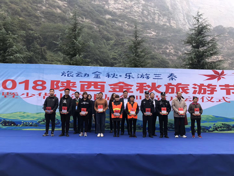 陕西省旅游发展委员会规划发展处副处长董亚美发布了全省金秋旅游活动和惠民行动计划,省旅游协会副秘书长焦永超公布了2018“金秋陕西免费之旅”推荐的250余处景区点名单,渭南市文物旅游局副局长刘煜揭晓了获评2018“陕西醉美秋色”的风景地名单,渭南市文物旅游局还进行了欢乐金秋精彩推介。市区旅游部门、旅游协会和华州区相关领导向来自基层各领域代表赠送了首批陕西金秋旅游大礼包。一次又一次的惊喜不断传出,欢乐金秋的声音传遍少华山谷,传向华夏大地。
